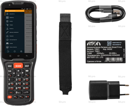 ТСД, БП, кабель Type C - USB 2.0, АКБ, ремешок. |