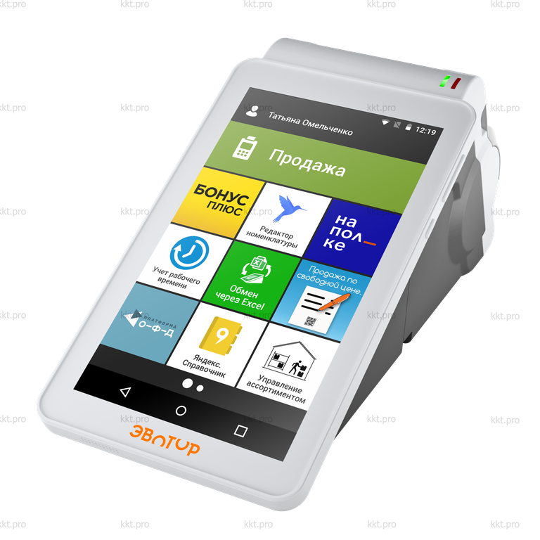 Смарт-терминал ЭВОТОР 7.2 - первый кассовый аппарат с возможностью передачи данных в налоговую инспекцию через оператора фискальных данных. Данный кассовый аппарат не только подходит по новым требованиям 290-ФЗ, но и обеспечивает торговую точку малой автоматизацией, благотаря товароучётному программному обеспечению в составе терминала. Позволяет завести номенклатурные позиции через кассу или настроить обмен с товароучетным программным обеспечением 1С, Контур.Маркет, Мой Склад. Поддерживает продажу алкогольной и спиртосодержащей продукции с возможностью подтверждения товарно-транспортных накладных и фиксацией продажи крепкого алкоголя (ЕГАИС).